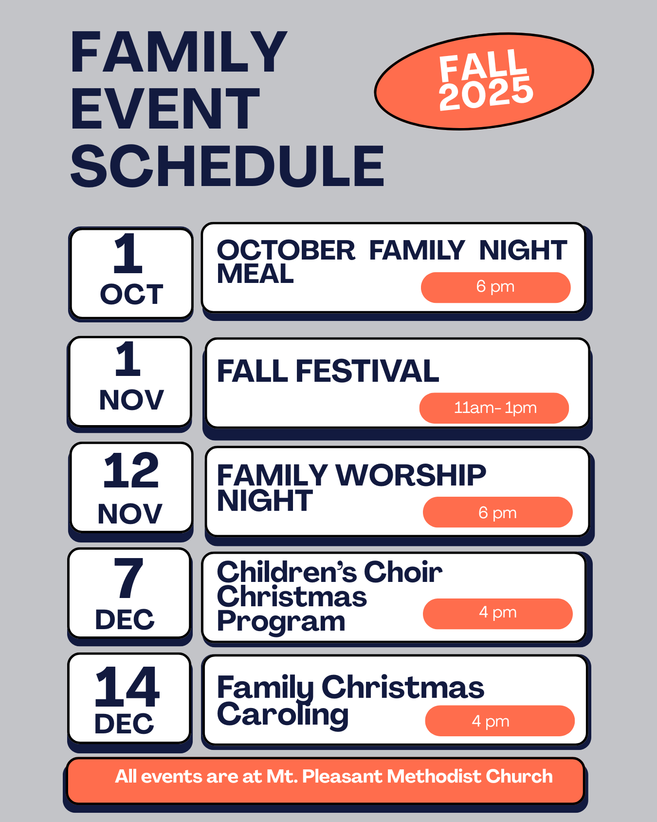 Throughout the year we have multiple opportunities for kids and families to stay connected within the life of the church. Click the button below for an updated family event calendar.
